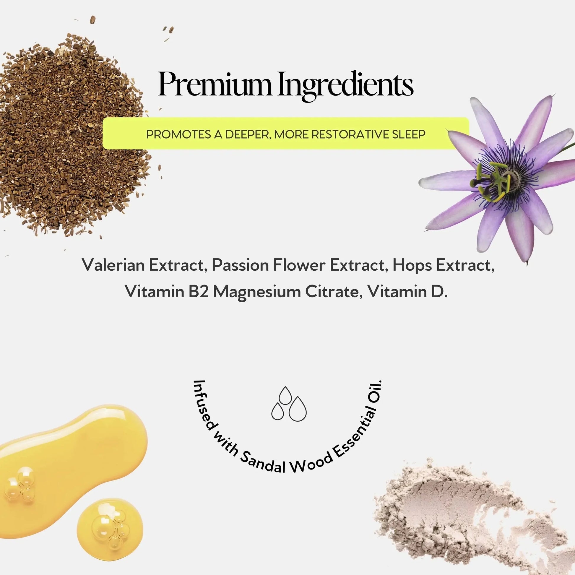 Valerian Extract, Passion Flower Extract, Hops Extract,Vitamin B2 Magnesium Citrate, Vitamin D. Infused with Sandal Wood Essential Oil.